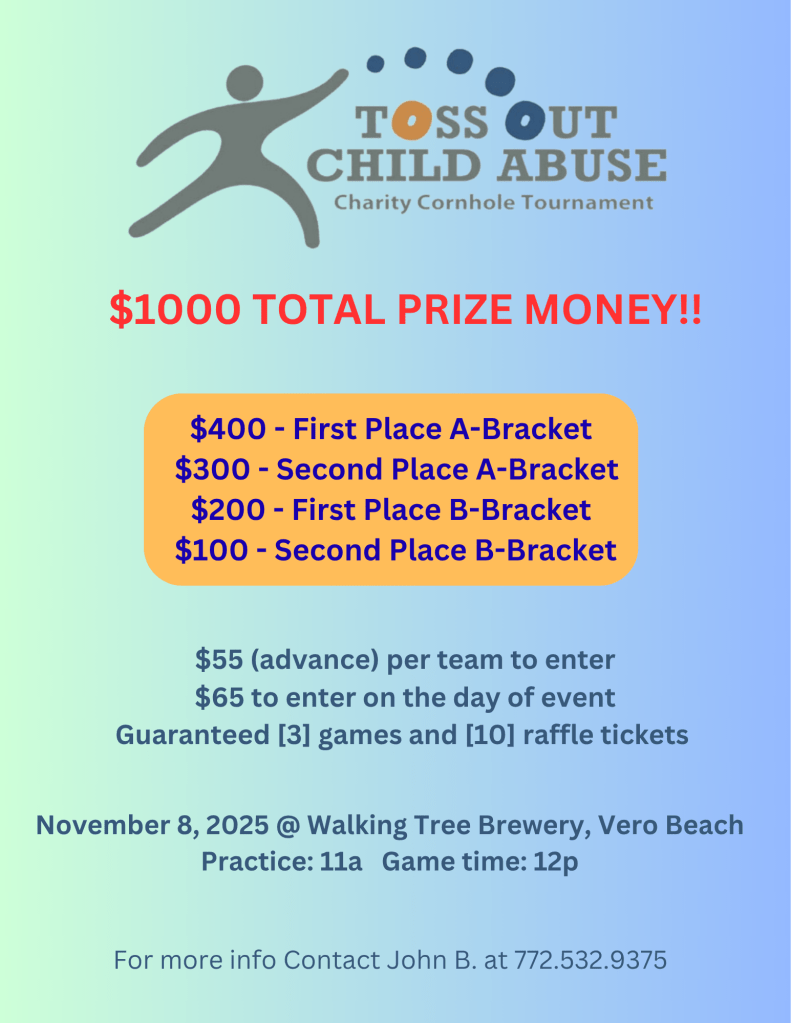 Weβre hosting a Charity Cornhole Tournament on November 8, 2025 at Walking Tree Brewery in Vero Beach β and you could walk away with part of the $1000 prize pool! π°